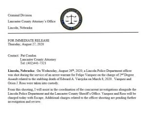 The Lancaster County Attorney released a statement charging Flipe Vasquez and Orion Ross with Escape after yesterday’s events near Hartley Elementary School in central Lincoln.