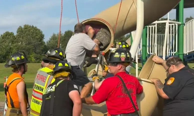 Here’s an accident that could happen to any one of us at any time. A 40 year old man in Vermont had to be rescued after he………. Got stuck in a slide on an elementary school playground.