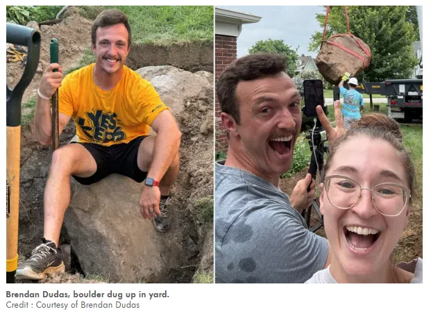 Documenting the process on TikTok, Dudas received advice from viewers, including suggestions to use a crane. He was cautious about potential damage to his or his neighbor’s foundation, so he proceeded with trial and error before eventually enlisting a crane company. The boulder, once removed, was found to weigh over 10,300 pounds and is estimated to be between 10,000 and 15,000 years old, dating back to the end of the last Ice Age.
